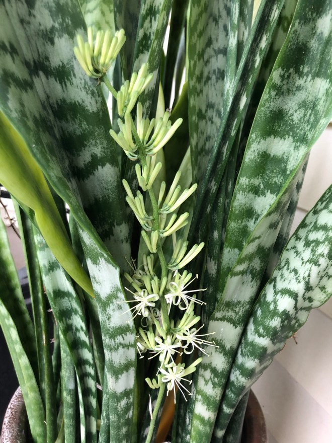 | These plants are easy care gems for the house, office and your porch in the summer months. They have an upright growing habit so they stay nicely contained in their space. Some grow tall and spiky up to 3 or 4 feet tall. Some have solid striped leave and others have a yellow gold edged leaf. Their leaves can be straight and tall or short and squat. They have a twisty curvy sister too. Grow one or more and add cool texture and interest to any room, office or porch. Even NASA studied the snake plant and really likes it for its air cleaning abilities. Now I know, most of us want to be as kind to our green leafy babies as we can be but this is truly one baby that survives happily on a little healthy neglect. They like light as much as any plant however, they are very tolerant of accepting whatever location relative to light that their human caregivers want to place them, and they don’t complain too much if they don’t have a regular watering schedule. In fact, this is one plant that actually prefer to live in a little tighter quarters than most and doesn’t need, nor require, regular repotting’s into bigger pots. They can actually hangout in the same pot for years. Some say that it might be mean and stressful for the plant to leave them in the same pot so long, but I have to disagree. You see when a snake plant is “stressed” it blooms. Yes, I said BLOOMS. Snake plant flowers grow on a very long flower spike that emerge from the base of the plant. The flower spikes get quite tall nestled in among the leaves and will be covered in many flower buds that when fully open will be reminiscent of an exotic white lily. If the surprise and the beauty of the flower is not enough it has a strong but very pleasant scent to add to the joy. Thus, I say they bloom because they are happy, snug as a bug in a rug with all their friends and family. It’s their way of smiling at us. |