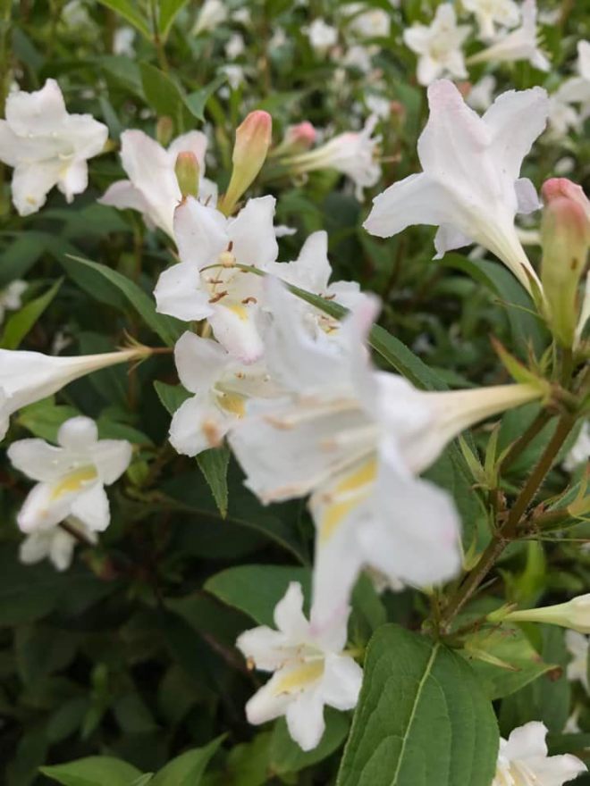 White Knight Weigela is a spring blooming, multi-stemmed shrub with gracefully arching branches. The prolific white trumpet shaped flowers are edged in soft pink.